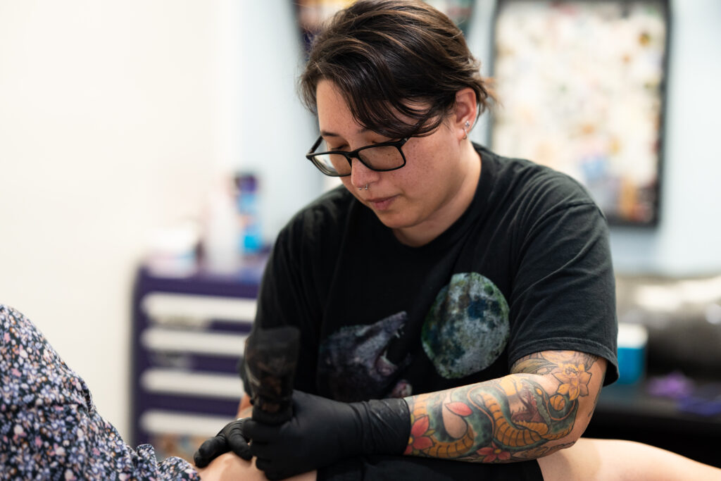 Elise is known for her patience, calm energy, and strong attention to detail. She takes the time to ensure every tattoo is executed with care, and that each client leaves feeling confident and thrilled with their new artwork.
